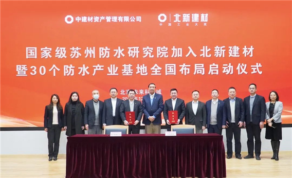 ? ? 2020年12月30日,防水行業唯一國家級研究院——中國建筑材料科學研究總院蘇州防水研究院(以下簡稱“蘇州院”)加入北新集團建材股份有限公司(以下簡稱“北新建材”)簽約儀式在北京未來科學城北新中心舉行。北新建材黨委書記、董事長王兵和中建材資產管理公司黨委書記、執行董事、總經理高則懷分別代表雙方簽署戰略合作協議,中國防水協會秘書長朱冬青代表行業見證簽約,簽約儀式由北新建材副總經理管理主持。中建材資產管理公司副總經理劉志平、財務部總經理商慶國,蘇州院院長巢文革、副院長瞿建民、總工程師楊勝,以及北新防水集團在京干部員工見證簽約。